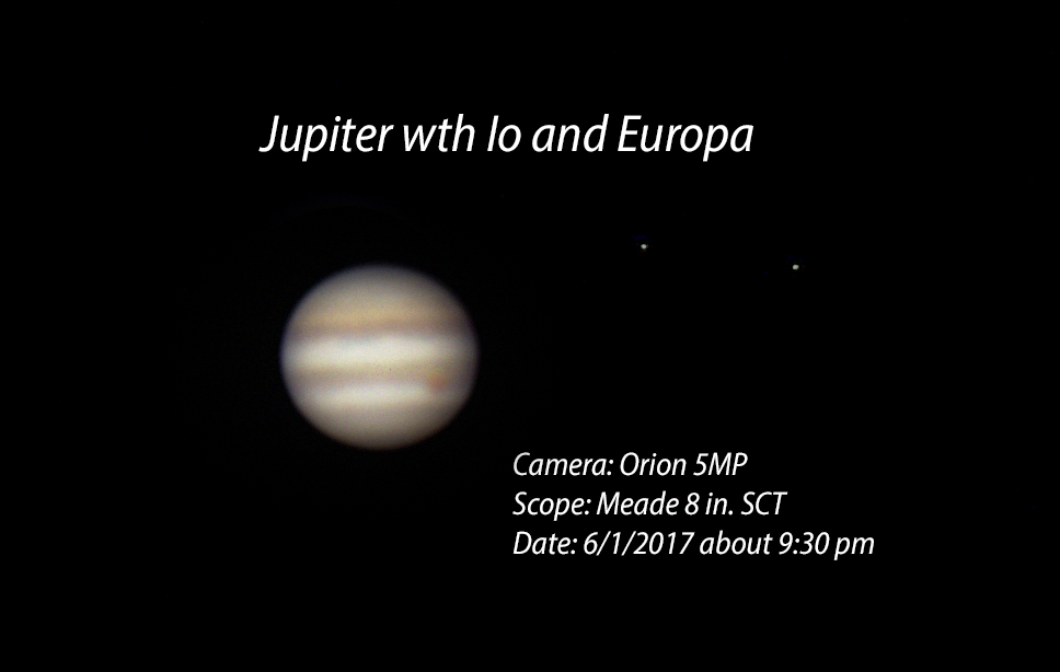 Two clear nights in a row! A June 1st observation of Jupiter appears below. Jupiter was from a video with 47 images stacked in RegiStax6 to reduce noise. A single, overexposed tif image was used for the moons. I couldn't get my Starry Night program to show the moons and the planet like they appeared in the eyepiece and camera; the moons were shown on the other side of Jupiter but the red spot was as shown below??? in Starry Night.