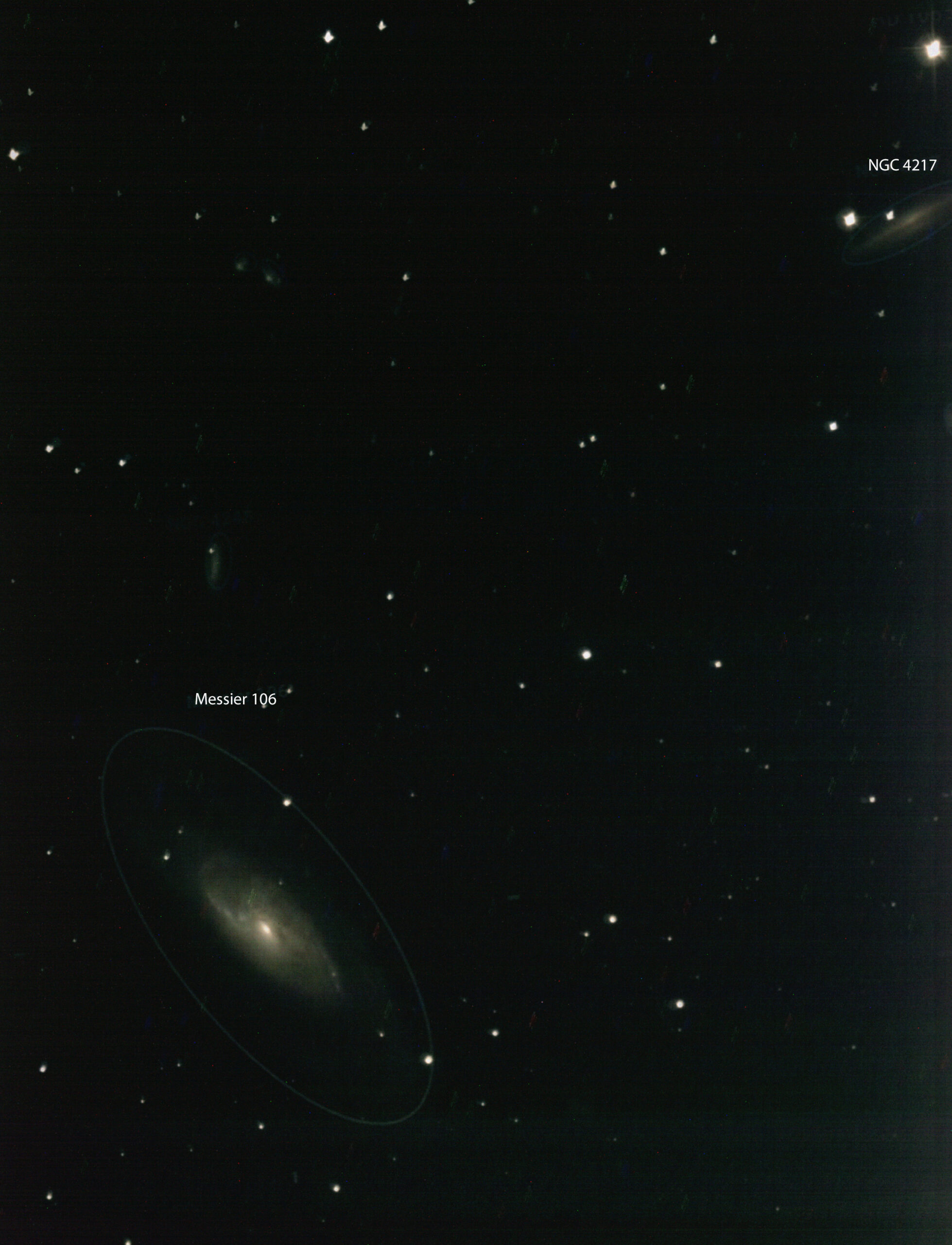 March 18, 2025 at 6:12 pm #15352Galaxies are everywhere in the skies during this season (late winter-early spring). Sky and Telescope’s May 2025 issue has some great articles on galaxies and the cover highlights Messier 106. My attempt at imaging M106 appears below. Stellarium views of the sky were used to help identify some of the galaxies present.