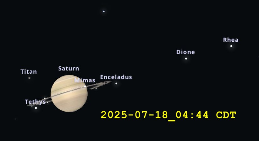 PHOTO DETAILS: ’This photo was taken on 8/3/2025 at 3am with a Meade 10” SCT, the camera was a ZWO(ASI183MC). 200 video frames were stacked in Autostakker3 and enhanced with Registax6 and Photoshop Elements 2020.’ The image in b was brightened to produce the photo a where Titan is indicated. Images have been rotated to match the appearance in Stellarium.