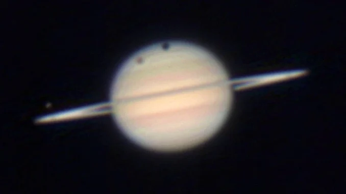 Bob wrote on Forum: Finally teased out Titan’s shadow on Saturn early this am (taken about 4 am). Used the 6″ scope (Quattro) and took a 100 frame video. Processed with AS3, and Registax6.