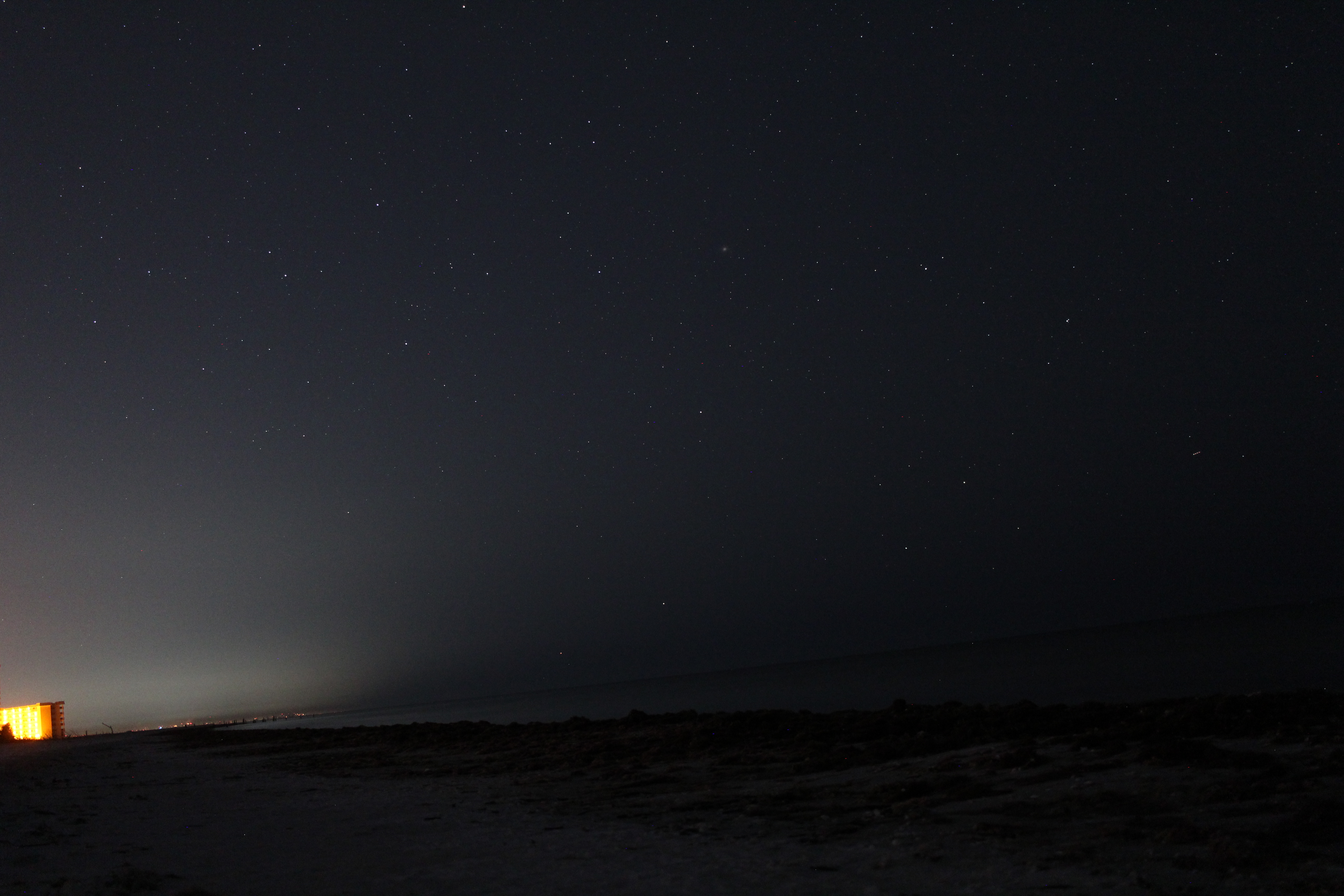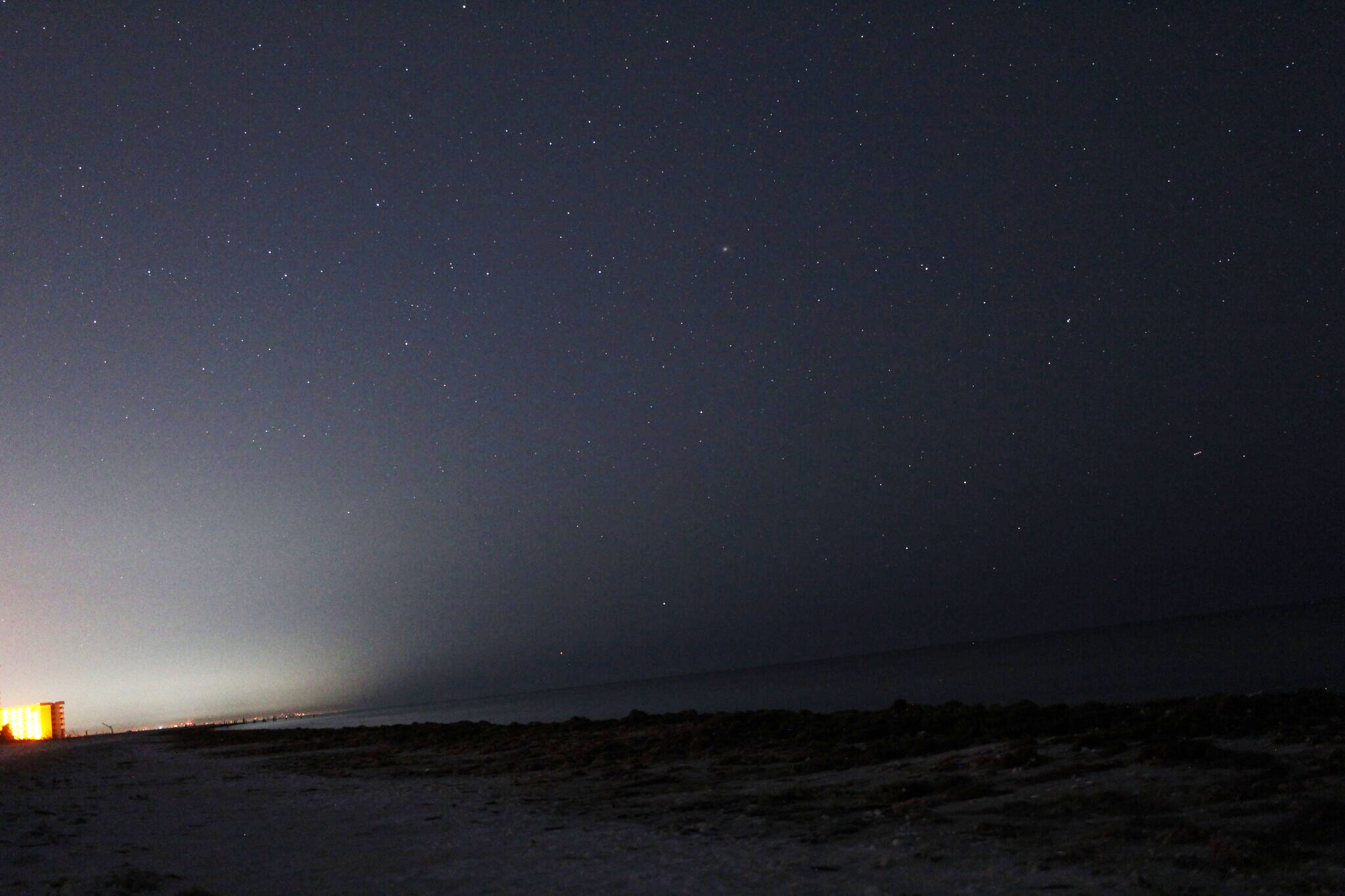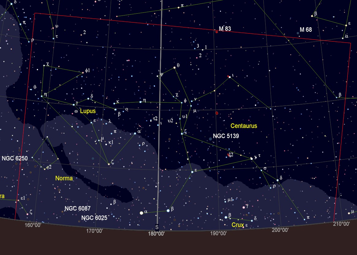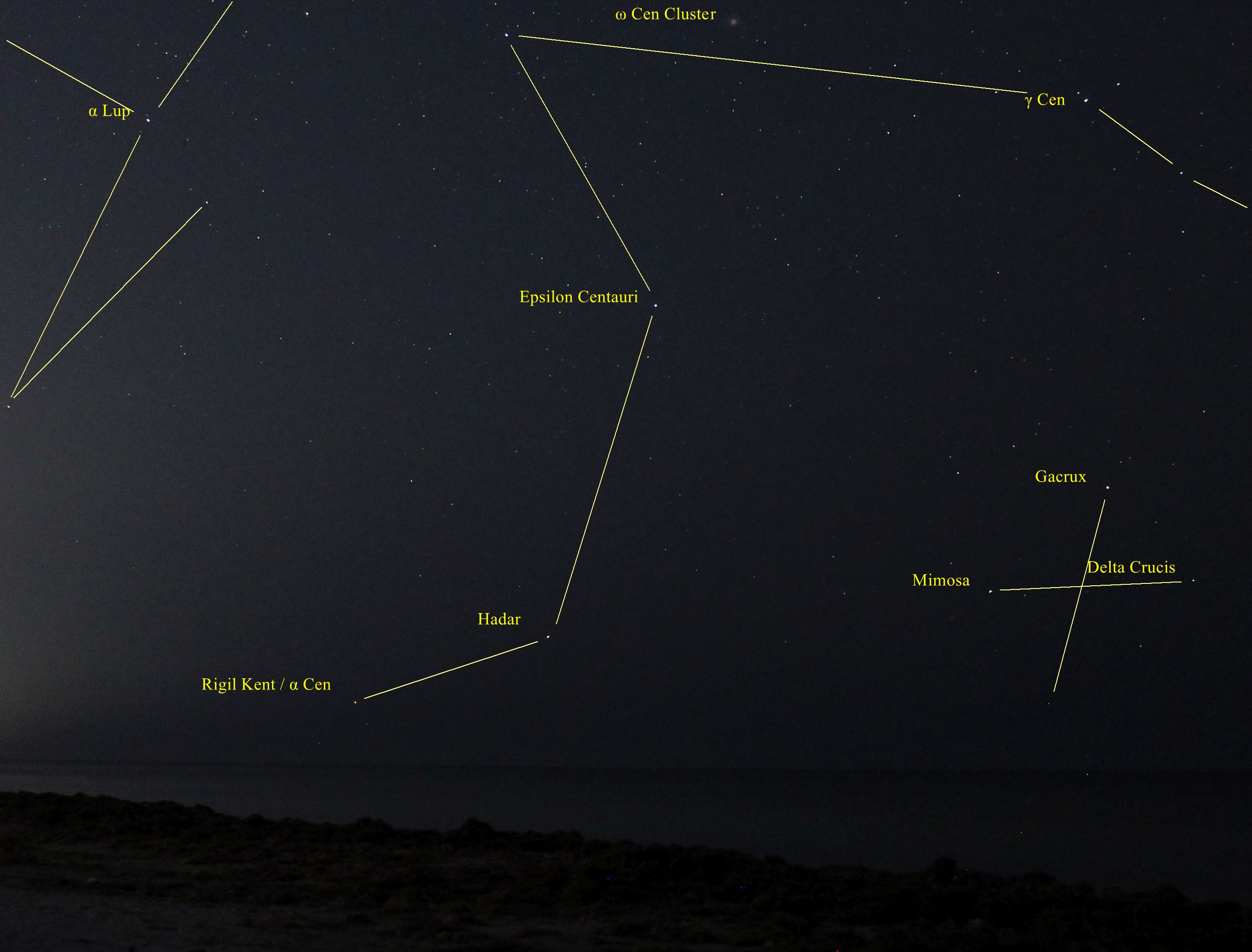 On the morning of January 24th I went out to the beach. In the southeast the constellation of Scorpion was rising. And in the south I recognized the constellation of Centaurus, which was unknown to me. Down low on the horizon were two fairly bright stars, Alpha Centauri / Rigil Kent and Hadar, easily visible to the naked eye. Here is a picture I took at 5:33 in the morning from the beach, unfortunately, the sea level here is not horizontal, it is inclined about 7 degrees. The image in the header of the article is annotated. To my surprise, the globular star cluster Omega Centauri (Caldwell 80) is easily visible. I saw three stars from the Southern Cross, but I couldn’t see the southernmost one Acrux even in 10×50 binoculars. But here in the 4s exposure it is faintly visible. Click on pictures for full resolution.