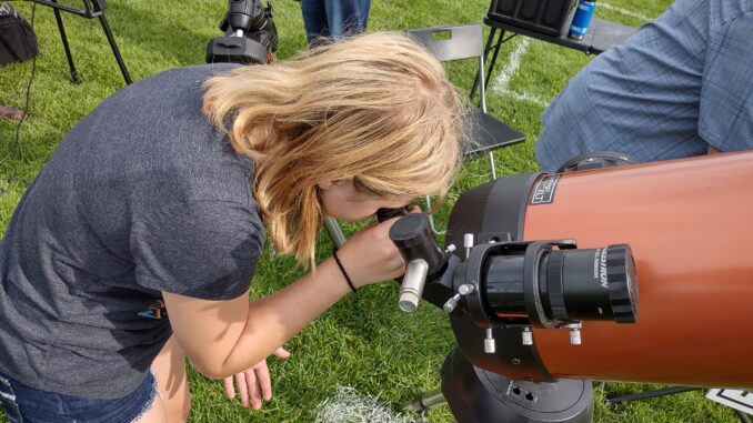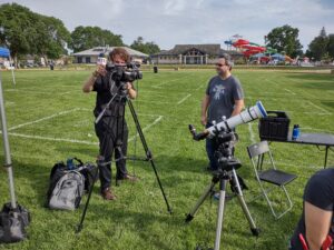 The weather was not very favorable at first, as it was cloudy. Later, the sun did shine through, but its intensity was not sufficient for the H-alpha telescope. In the end, however, the sky cleared up and we were able to show visitors the Sun in H-alpha light, as well as sunspots in integral light through the appropriate filters. Mike C. and Mike Q. participated in the observation with their telescopes. Rob played an important role, helping to talk to people and watch over our equipment. John M lent his H-alpha telescope for this event, even though he couldn’t be there himself. This was important because visitors could compare the view of the Sun in different telescopes through different filters.